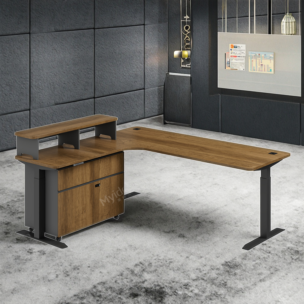 एल आकार की विद्युत लिफ्टिंग टेबल, चलती उप कैबिनेट भंडारण स्थान के साथ, केबल संग्रह प्रणाली के साथ मुख्य डेस्क, कार्यालय डेस्क